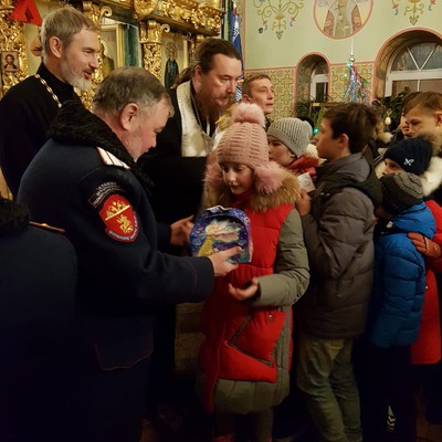 Ни один ребенок, пришедший на первую в современной истории Белгородской области Атаманскую рождественскую елку, которая была установлена во дворе казачьего храма преподобного Сергия Радонежского, не ушел в этот морозный вечер без подарка. А гостей 7 января 2019 года пришло на праздник более трехсот малышей и их родителей. Обширный двор казачьего храма с трудом вместил всех желающих принять участие в праздновании Рождества Христова.