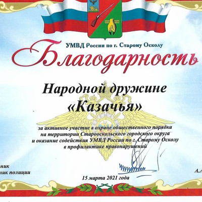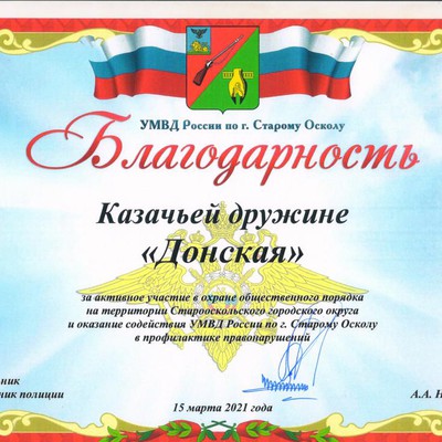 01 апреля 2021 года перед УМВД по г. Старый Оскол проходил совместный инструктаж нарядов комплексных сил УМВД, на котором кроме сотрудников УМВД принимали участие Дружины. Благодарностью Начальника УМВД г. Старый Оскол были награждены шесть лучших дружин Старооскольского городского округа, в том числе обе казачьих дружины. Награждено двадцать четыре дружинника из них шесть – казаки Дружины «Донская».
