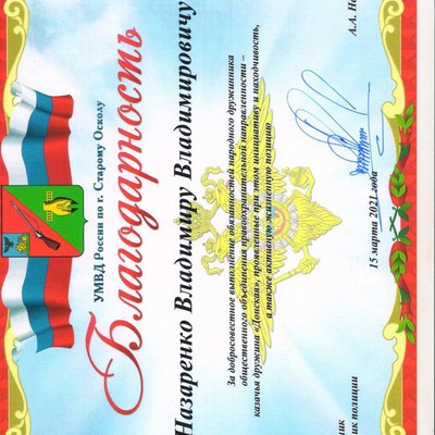 Благодарностью Начальника УМВД г. Старый Оскол награждены казаки ДКД «Донская»: